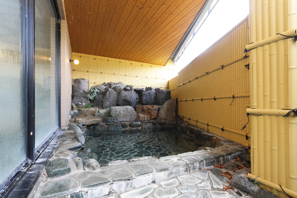 当館の人気施設、岩風呂タイプの露天風呂です。疲れた体に、スポーツや勉強後に湯ったり、湯っくり寛いでください。竹垣の向こうには富士山を眺めることができ、夜には満天の星空を眺めながらの入浴が可能です。内風呂と隣接しているため、行き来も楽ちん!大人が約7~8人が同時にご利用いただけます。